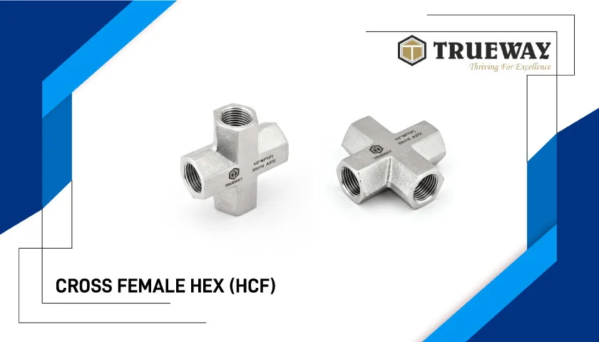 TRUEWAY Cross Female Hex is a four way Connector with Female Pipe Threads on all four Sides of the joint. It is a precision engineered component, used for achieving high pressure leakproof cross joint between Four Male threaded open ports.
